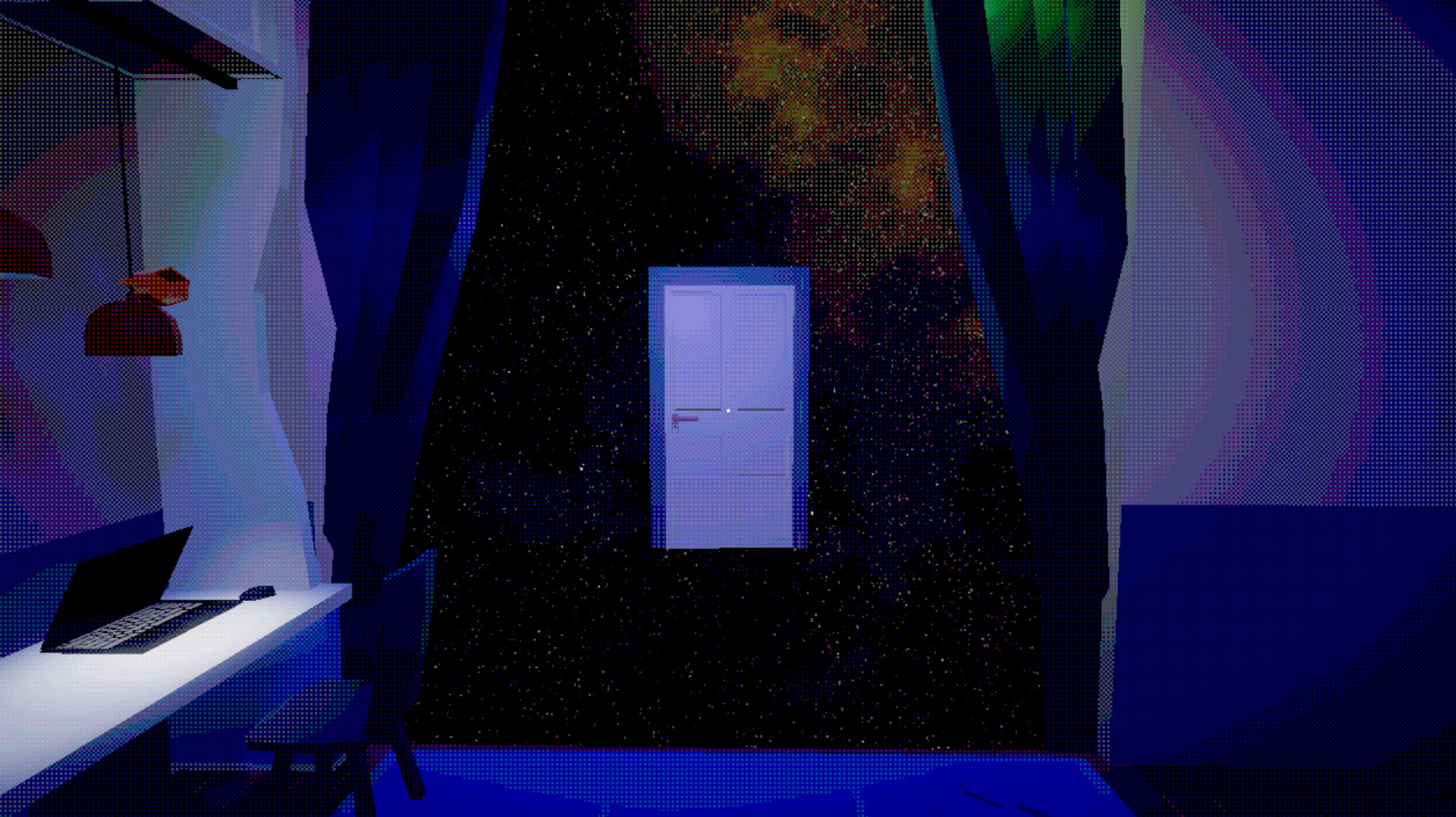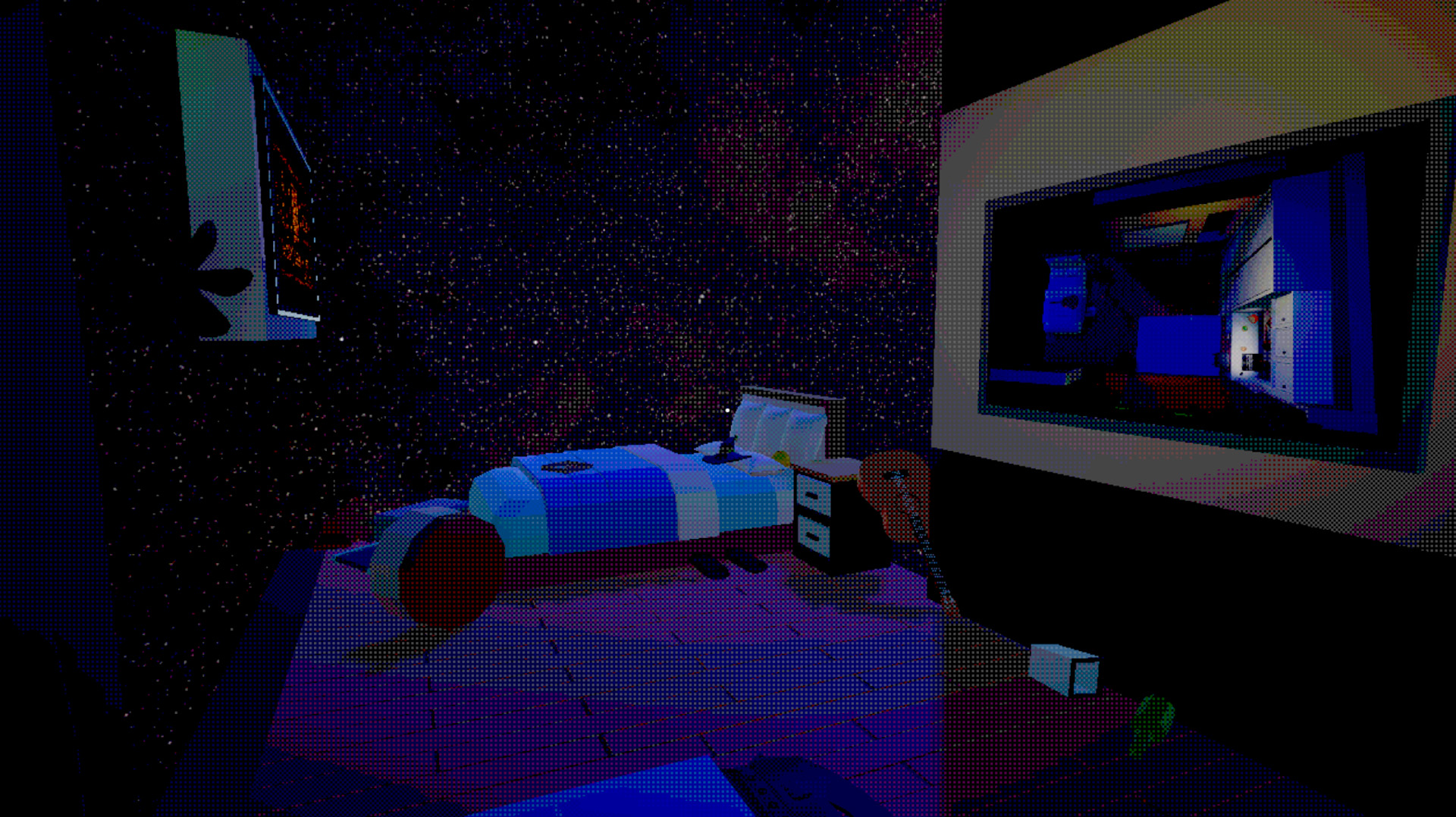 (Необходимо расставить предметы в соответствии с картиной на стене. Те предметы, которых нет на картине нужно выкинуть в бездну (подойдя вплотную к краю) или положить в шкаф (подойдя вплотную к шкафу). Можете смело пробовать выкидывать всё, нужные предметы выкинуть у вас не получится. Кружка висит на лампе над столом, вентилятор висит за телевизором, мусорка должна стоять под столом. Нож, к сожалению можно случайно положить под ковер, поможет только перезапуск.